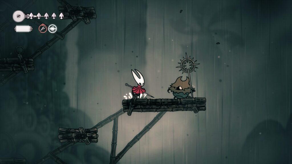 Tools? Ja hoor, naast je gewone aanvallen met je nagel en je silk attacks (ter vervanging van de soul uit het originele spel), kan je immers ook een heleboel wapens of voorwerpen vinden. Dat gaat dan bijvoorbeeld over messen om te gooien, meerdere soorten vallen om achter te laten, een elixir om je sneller en sterker te maken of zelfs een soort geweer. Als dat al heel wat klinkt, weet dan dat Silksong er nog veel meer bevat. Je kan een bepaald aantal van je gekozen tools meedragen, en wanneer je rust op een bank, gebruik je je shards, een van je twee grote betaalmiddelen, om ze terug te krijgen. Deze shards verlies je trouwens niet als je sterft, in tegenstelling tot de kralen. Die laatste gebruik je net zoals de geo uit Hollow Knight om allerlei zaken te kopen, laat je achter in een cocoon wanneer je sterft en moet je terugvinden zonder nog eens te sterven (maar waarvoor je deze keer niet je eigen geest moet verslaan) tenzij je ze allemaal wil verliezen.