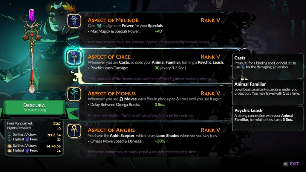 Ook de verschillende aspecten van je wapens keren terug. Dat betekent dat je zelfs met hetzelfde wapen heel veel variatie in je runs kan creëren. De ene versie van je staf geeft je gewoon meer en krachtigere magie, maar een andere (heel sterke) laat je meegenomen dierenvriend ook een cast gebruiken en een dodelijke link tussen jullie creëren terwijl nog een derde een voor vijanden pijnlijk schild maakt en je in staat stelt om zielen van gevallen vijanden in je strijd in te zetten. Ook hier zijn sommige unlocks weer wat gebaseerd op de RNG, en het kan lang duren voor je de 24 mogelijkheden van je wapens beschikbaar hebt. Daarnaast kan je jezelf met magische arcana-kaarten of keepsakes nog extra bonussen geven.